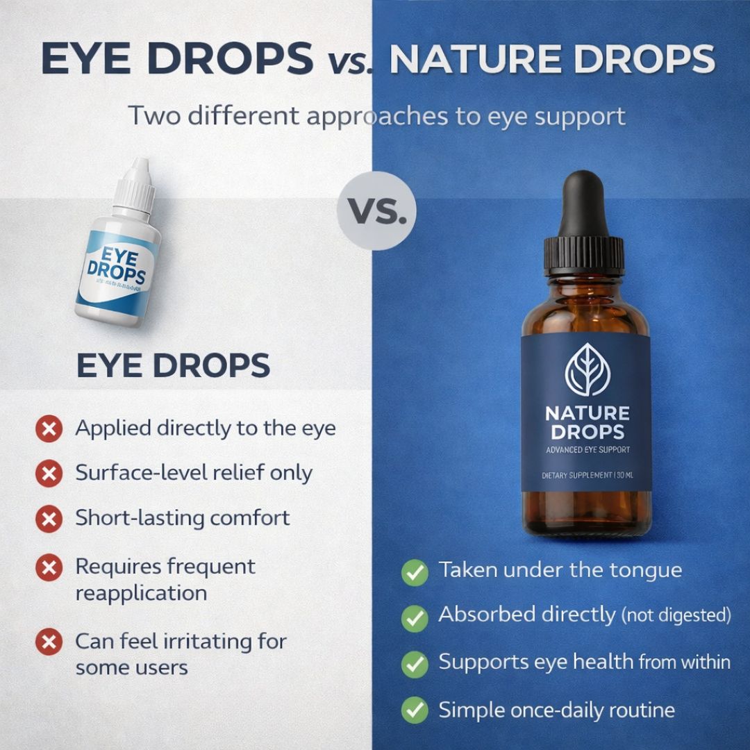 Stop masking the symptoms and start supporting your vision at the source. Unlike traditional eye drops that offer only temporary, surface-level relief, Nature Drops is a premium dietary supplement designed to nourish your eyes from the inside out. By targeting internal eye health rather than just surface irritation, Nature Drops helps you reclaim the clarity and comfort your eyes deserve.